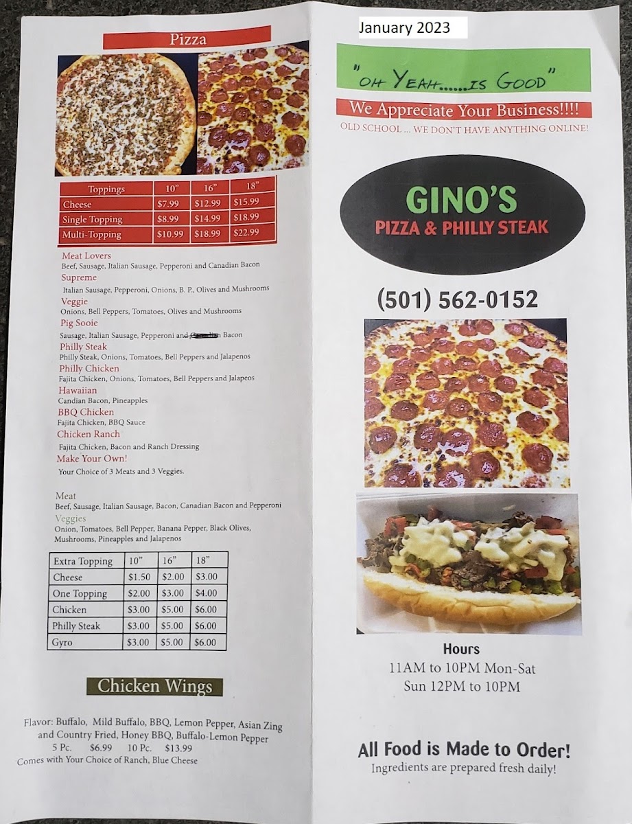 Welcome to Gino's, a delightful pizza restaurant located at 8000 Geyer Springs Rd, Little Rock, AR. Known for its incredible variety, Gino’s menu is a celebration of flavors that appeals to everyone. From their Supreme Pizza to the indulgent Philly Cheese Steaks, every bite promises freshness and satisfaction.